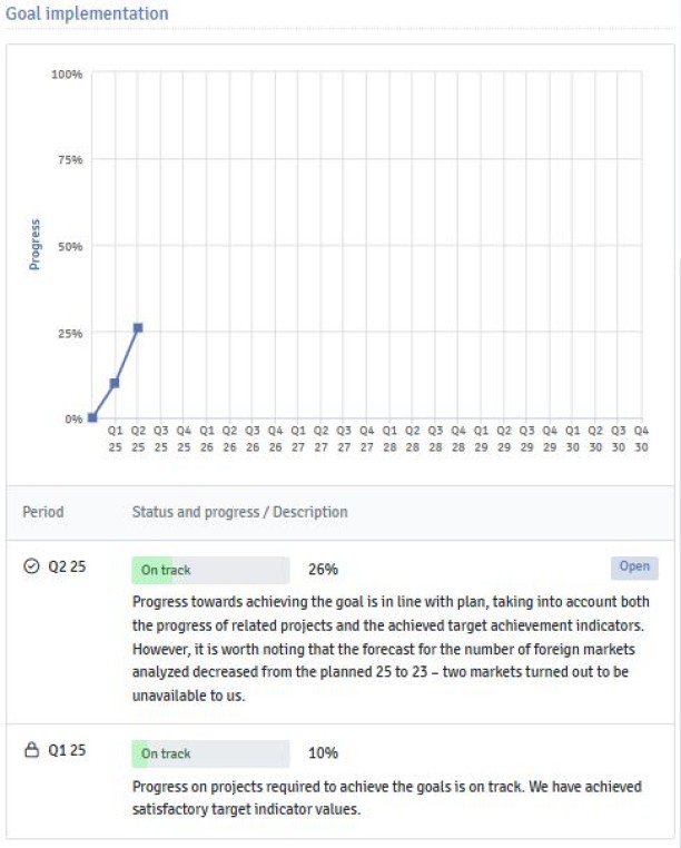 Effective monitoring of strategy implementation requires making decisions about the basis on which the progress of individual strategic objectives will be assessed (solely subjectively, or also by including the progress of related projects and indicators), as well as defining the cycle in which the progress of objectives will be reported and analyzed. It is also worth considering the method of providing progress data (in particular, actual and forecasted indicator values), including integrations with existing systems, to minimize manual work related to maintaining the up-to-date status of objectives.