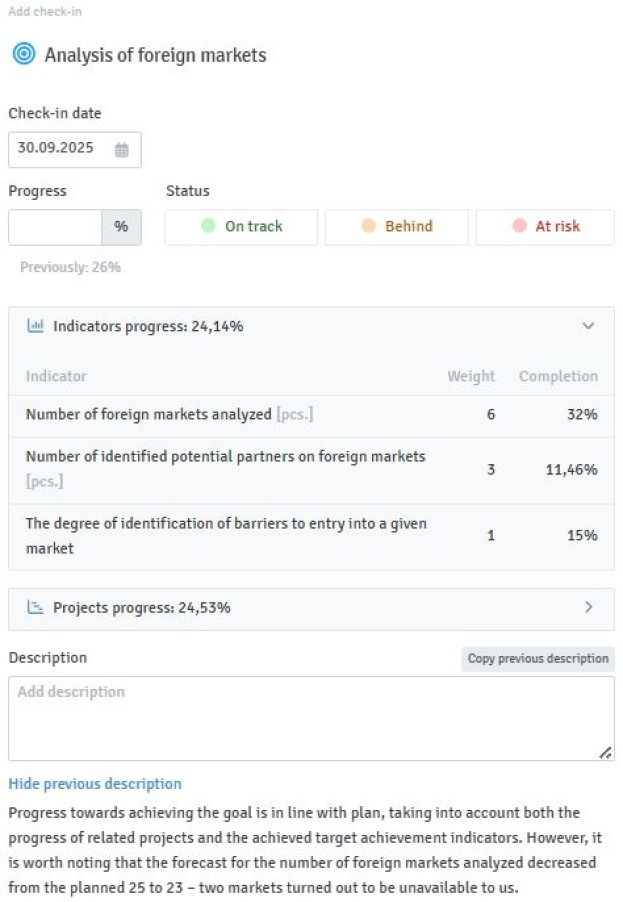 Figure 5. Update entries on the progress of objective achievement.