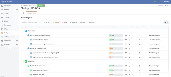 For each objective, we can quickly check its status (progress %, state, and description), whether any indicators (KPIs) or projects are assigned to it, and who is responsible for its achievement. Filters make it easy to find objectives that require our attention (e.g., delayed or at risk), have a specific level of completion (%), or are assigned to a particular person (manager).