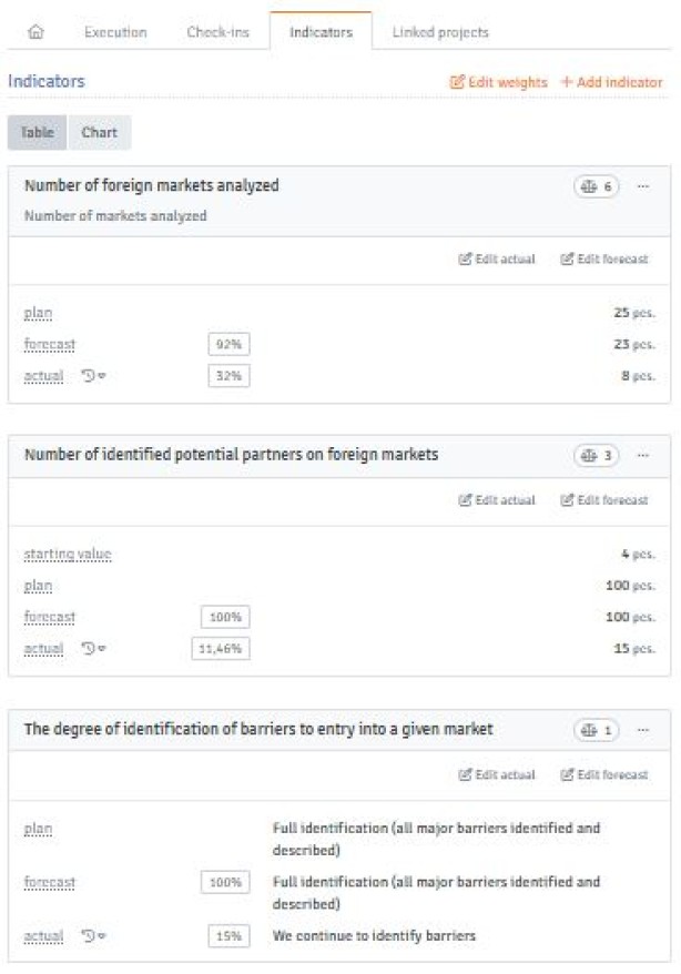 In turn, including indicators in the assessment of an objective requires providing information on the current progress of each indicator, optionally with forecasted indicator values (both numerical and descriptive), as well as considering the weight of each indicator in the achievement of the given objective (see Fig. 3 and Figs. 4a and 4b).